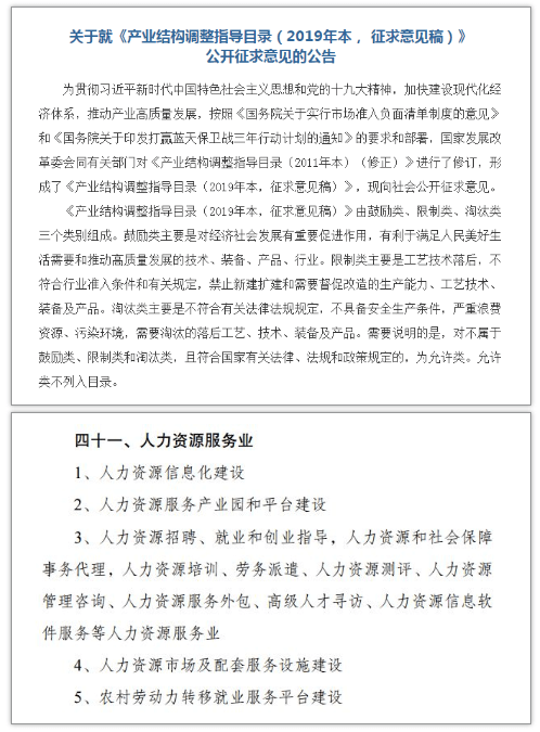 近日,国家发改委发布了《产业结构调整指导目录(2019年本,征求意见稿)》(以下简称《征求意见稿》),人力资源服务业进入产业结构鼓励类目录,这标志着人力资源服务将不仅仅是企业配套服务,而是已经形成巨大的产业内核。
