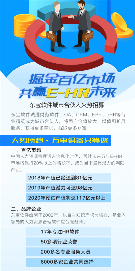 如今,人力资源服务业正处于快速发展期,人力资源管理软件行业作为人力资源服务业下的一个朝阳行业,在未来3年定是新的“金矿”!东宝软件17年专注于人力资源管理软件的研发与创新,已是业内领先的人力资源管理软件综合服务商,现乘着政策利好的东风,诚邀财务软件、OA、CRM、ERP、eHR等行业精英成为城市合伙人,将用户价值放大,增值和扩展服务,共推人力资源信息化建设,共赢人力资源管理软件未来!